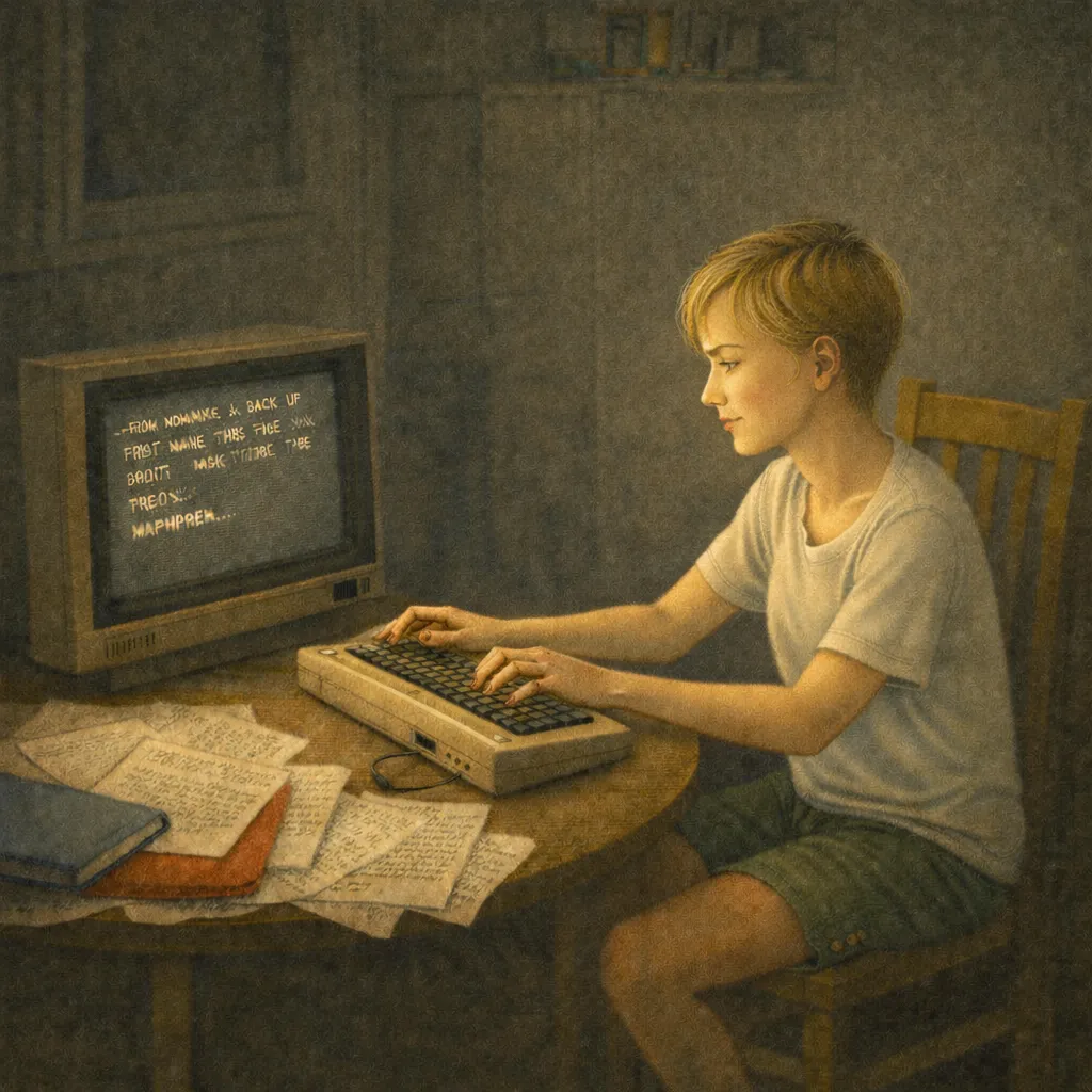 Dann schleppt Jukka diese beige Kiste rein, und auf dem Fernseher flackert READY. auf. Ich spüre sofort: Das ist kein Gerät, das ist ein Komplize. BASIC ist wie Mathe mit Tasten: stumpf, ehrlich und schnell. Genau das brauche ich, wenn meine Finger schon streiken.