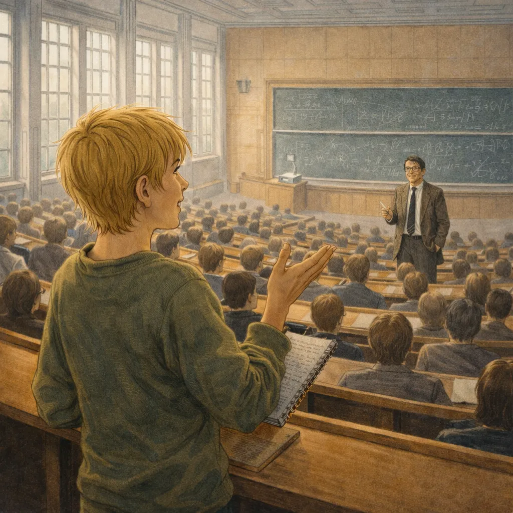 Vorn steht Klaus von Klitzing, mit Kreidestaub am Jackett, und schreibt: . Er spricht ruhig, fast wie mein alter Physik-Lehrer. Ich höre vor allem ein Wort immer wieder: Stufen. Nicht „irgendein Verlauf“, sondern feste Stufen, die immer wiederkommen.