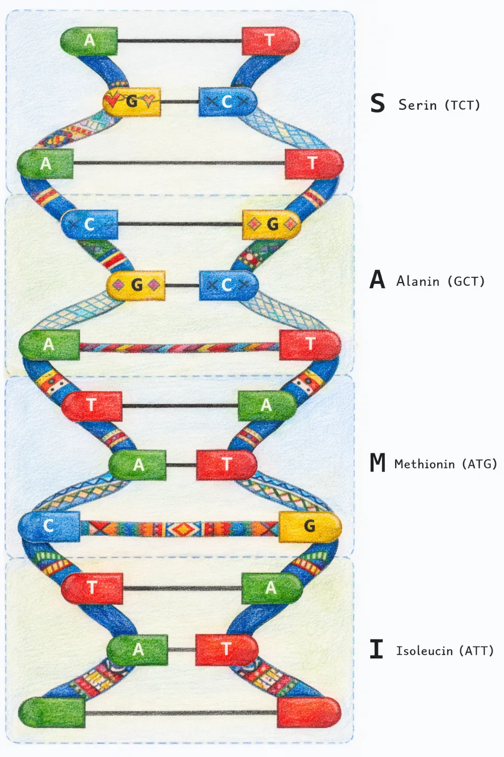 Drei Basen hintereinander ergeben ein Codon, also einen Mini-Befehl für die Zelle: Welche Aminosäure als Nächstes eingebaut wird.